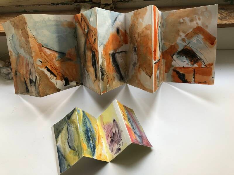 I then work with colour and line with a number of different media, brushes and tools to interpret my visual response to the landscape and thoughts.